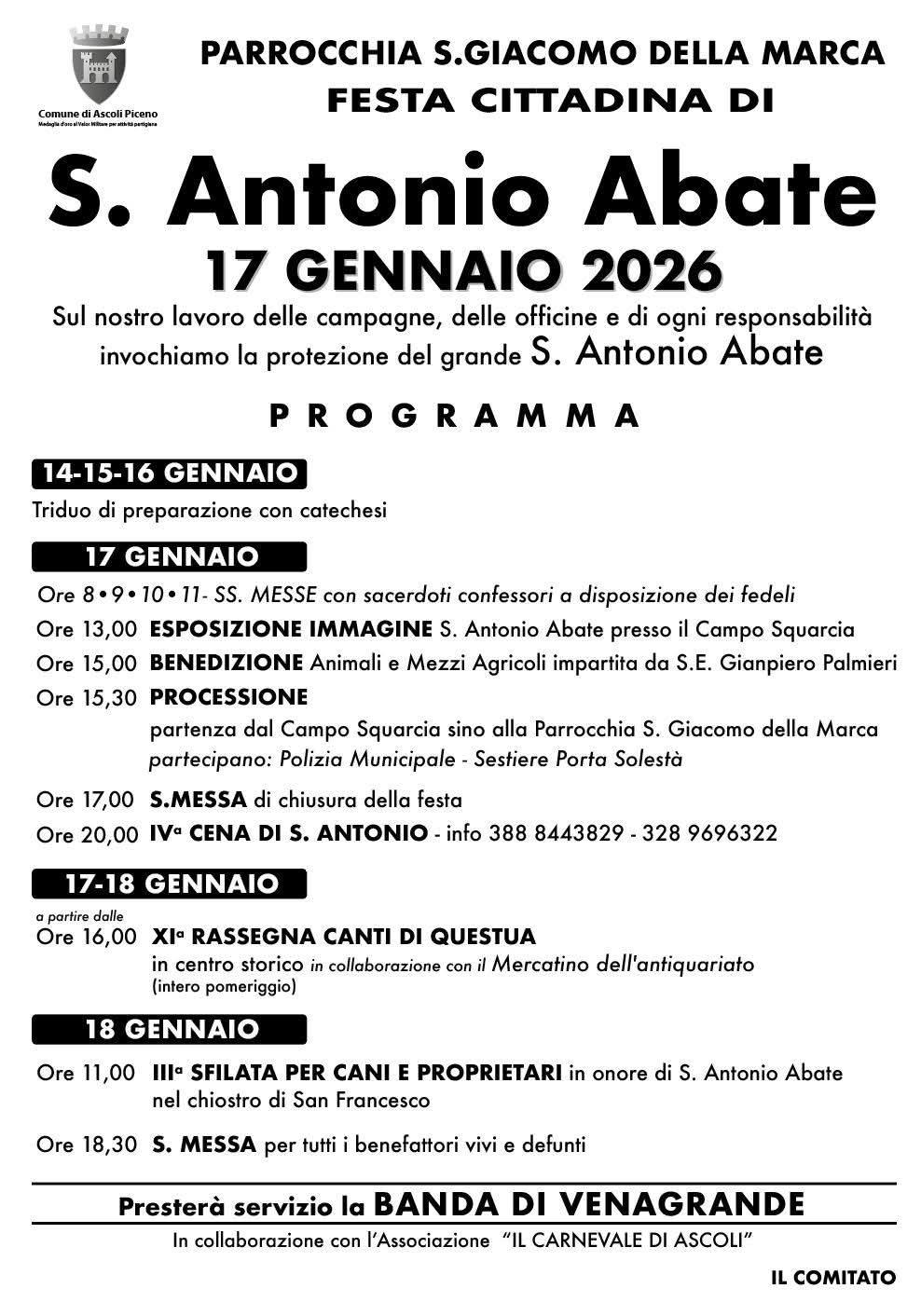Venerdì 17 Gennaio il programma religioso prevede la celebrazione delle Messe ogni ora, dalle 8 fino alle 11; poi alle ore 13 ci sarà l’esposizione dell’immagine di Sant’Antonio Abate in Piazza Arringo e alle 15 la tradizionale benedizione degli animali e dei mezzi agricoli, impartita dal Vescovo Gianpiero Palmieri. Alle 15.30 partirà la processione, che si concluderà alla parrocchia di San Giacomo della Marca. A seguire, alle ore 17, ci sarà la Messa di chiusura della festa, mentre alle ore 20 si terrà la III cena di Sant’Antonio al ristorante Villa Angelini (per info e prenotazioni 388.8443829 – 328.9696322).