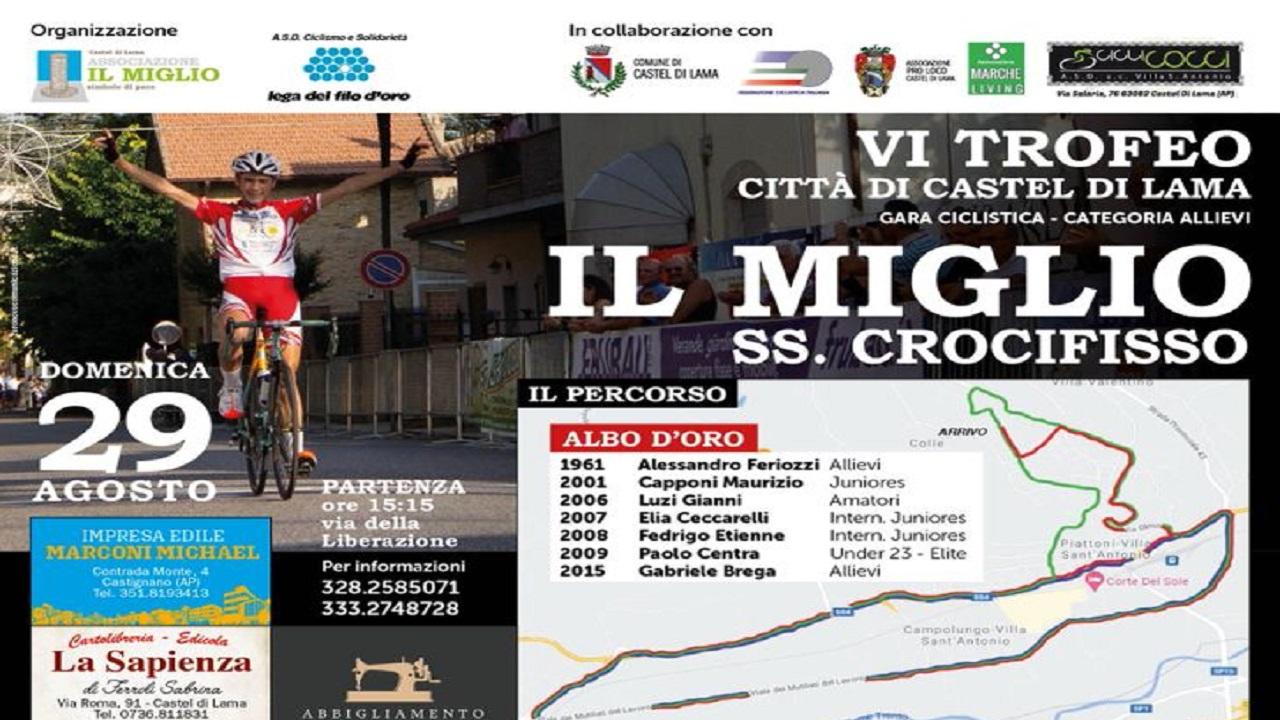La data del 29 agosto si avvicina e a Castel di Lama sarà un grande spettacolo di sport e di giovani con la categoria allievi in vista della sesta edizione del Trofeo Città di Castel di Lama-Il Miglio SS Crocifisso a cura dell’associazione Il Miglio e dell’Asd Ciclismo e Solidarietà-Lega del Filo d’Oro.
