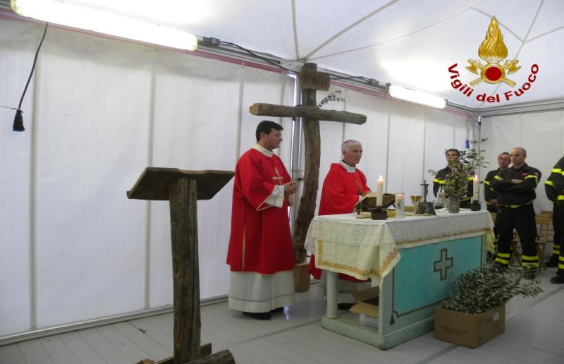 Domenica 9 Aprile presso il campo base dei Vigili del fuoco a Pescara del Tronto è stata celebrata la Santa Messa della Domenica delle Palme. Una cerimonia fortemente voluta dal personale ancora presente nei territori della provincia di Ascoli Piceno devastati dai terremoti dei mesi scorsi. La funzione è stata officiata dal Vescovo di Ascoli Piceno Monsignor Giovanni D’Ercole, da sempre molto vicino ai Vigili del fuoco ed alla popolazione arquatana.