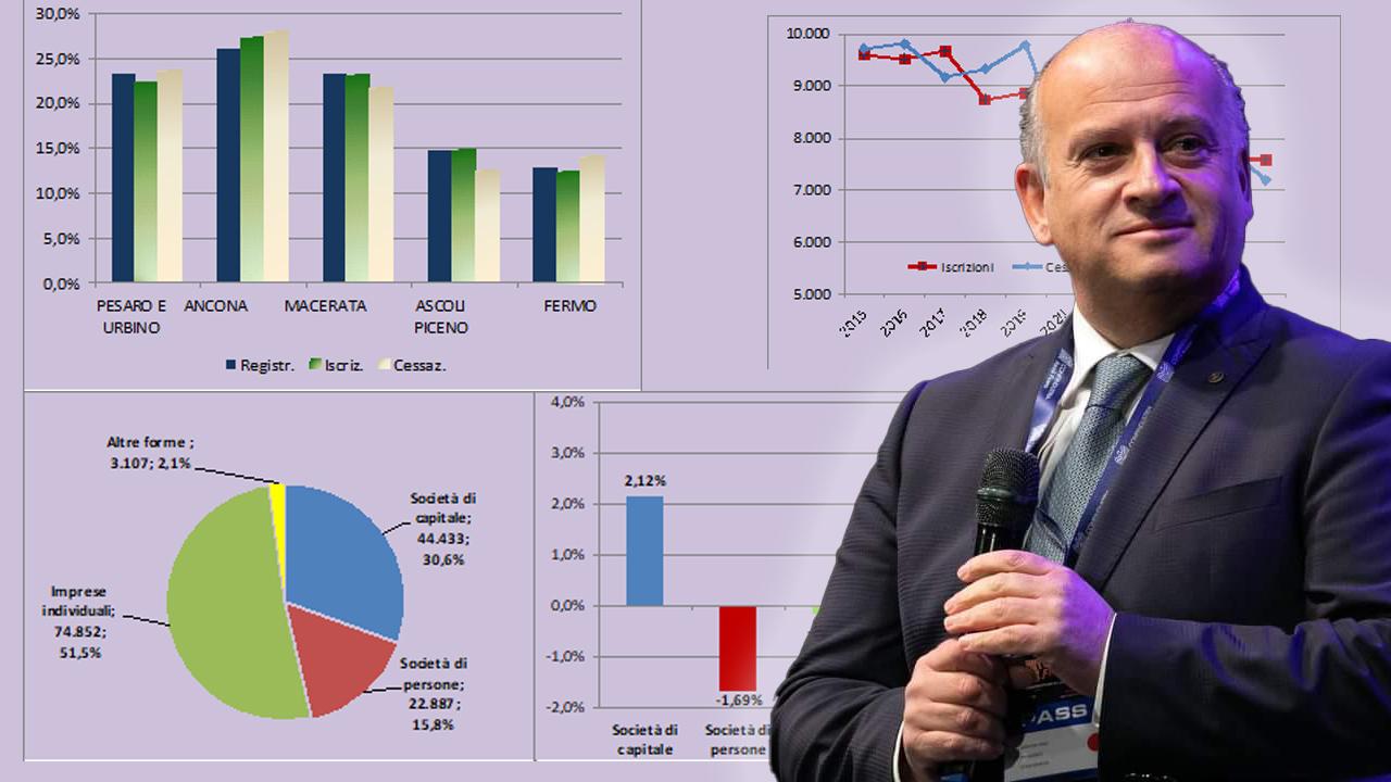 Alla data del 31dicembre 2025 si rileva una consistenza di 145.279 imprese registrate nelle Marche, 130.880 di queste sono attive, grazie ai dati forniti dalla rilevazione Movimprese di Unioncamere-Infocamere sui Registri Imprese tenuti dalle Camere di Commercio su base provinciale.