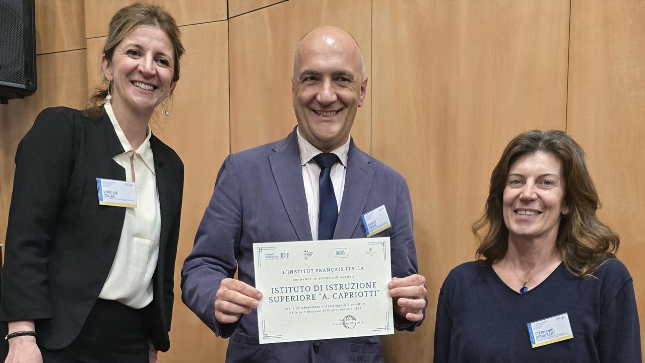 Il momento culminante della giornata, in seguito alla condivisione di idee, progetti e buone pratiche tra le diverse scuole, è stata la cerimonia di premiazione, durante la quale l’IIS “A. Capriotti” ha ricevuto una targa di merito: il riconoscimento premia l’impegno storico dell’Istituto nella promozione della lingua francese e nell'organizzazione di corsi di preparazione d’eccellenza con docenti madrelingua, in un percorso che ha portato la scuola a diventare, dallo scorso anno, sede accreditata per gli esami di certificazione Delf scolaire.