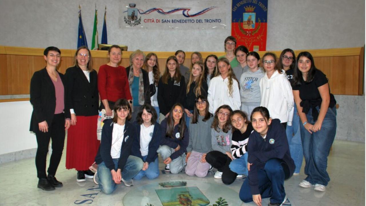 Il Commissario straordinario del Comune di San Benedetto del Tronto Rita Stentella ha accolto in sala consiliare, nel pomeriggio di mercoledì 11 marzo, alunne e docenti di scuola secondaria dei plessi “Sacconi” e “Manzoni” dell’ISC Nord insieme alle loro ospiti, 10 alunne e 2 docenti provenienti dalla città di Zabrze in Polonia, a San Benedetto per una settimana nell’ambito del progetto Erasmus+. Le alunne, che alloggiano presso le abitazioni di coetanee sambenedettesi, frequentano le lezioni in orario antimeridiano e svolgono attività culturali nel pomeriggio, per lo più inerenti alla tematica della sostenibilità ambientale. Le iniziative sono attuate con la collaborazione di associazioni collegate al programma Eco -schools, ma sono anche mirate alla conoscenza delle bellezze del territorio. Nel dare loro il benvenuto in città, la dr.ssa Stentella ha descritto brevemente le caratteristiche di San Benedetto e ha consegnato loro un piccolo ricordo della visita invitando le ragazze polacche a tornare a visitare San Benedetto durante la bella stagione insieme alle loro famiglie. Il progetto avrà uno sviluppo nel mese di maggio, quando otto alunni dell’ISC Nord saranno a loro volta ospitati in Polonia mentre altri dieci partiranno alla volta di Dobje in Slovenia, sempre grazie ai fondi garantiti dall’accreditamento Erasmus+ che permettono, oltre alla mobilità degli alunni, quella dei docenti che svolgono corsi di formazione all’estero e attività di job shadowing in altre scuole dell’Unione Europea.
