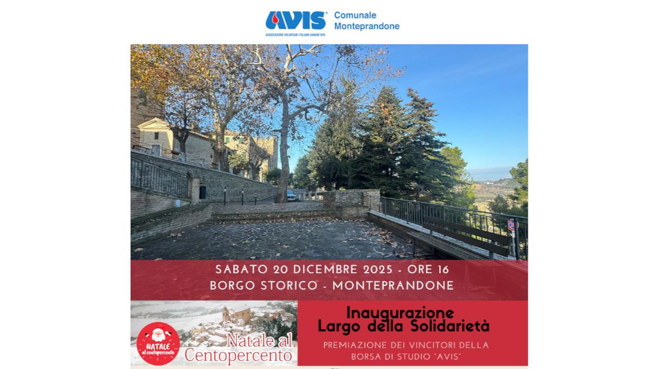 Appuntamento da non perdere, sabato 20 Dicembre, nel Borgo Storico di Monteprandone, dove in occasione del Natale al Centopercento, i volontari Avis e l’Amministrazione Comunale, inaugureranno il nuovo “Largo della Solidarietà”, adiacente alla Sala Consiliare. “Uno piccolo spazio che diventa uno dei simboli della solidarietà del nostro territorio”, dice Marcello Fratini, presidente dell’ Avis Monteprandone. “In questi anni, l’Avis Comunale di Monteprandone si è impegnata a far crescere i valori del dono, con eventi promozionali e con la presenza costante nelle scuole del territorio e la collaborazione con le varie istituzioni e le tante associazioni presenti. La nostra associazione vanta più di 500 soci donatori che grazie al loro prezioso contributo, incrementano le scorte di sangue e plasma necessarie a garantire l’autosufficienza regionale e soddisfare qualsiasi richiesta. Sia nel capoluogo che a Centobuchi, sono presenti dei simboli che danno lustro alla nostra associazione e che ricordano che ognuno di noi può essere utile al prossimo e al bene comune. Ricordiamo infatti la panchina Alibrì installata nel 2022 nel Parco della Conoscenza di Centobuchi e la panchina rossa posizionata all’interno del parco “Il Boschetto” di Monteprandone. Inoltre, su iniziativa dell’Avis Provinciale di Ascoli Piceno, proprio sulla parete nord della sala Consiliare, in primavera, verrà posizionato “Il Grande Mosaico della Solidarietà”, un mosaico di maiolica raffigurante i luoghi simbolo dove hanno sede le 13 Avis Comunali del Piceno.” Dopo l’inaugurazione del “Largo della Solidarietà” la festa si sposterà all’interno della Sala Consiliare, dove verranno premiati i vincitori della Borsa di Studio Avis, giovani donatori e collaboratori dell’Associazione che si sono distinti in ambito scolastico e che hanno scelto di donare qualcosa di loro stessi agli altri. In tale occasione, Alessandro Savino, responsabile “scuola e formazione” dell’Avis di Monteprandone, presenterà il nuovo bando di concorso per l’anno scolastico 2025/2026.