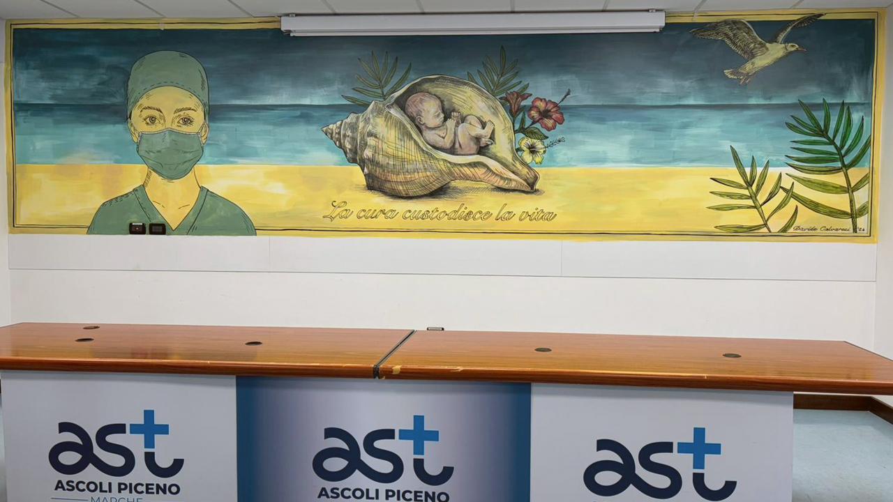 Nella sala convegni dell’Ospedale “Madonna del Soccorso” di San Benedetto del Tronto è stato realizzato dall’AST di Ascoli Piceno, grazie al sostegno della Fondazione Sambenedettese, un nuovo murales dell’artista offidano Davide Calvaresi dedicato alla cura e alla protezione della vita.