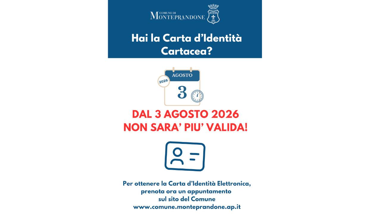Il Ministero dell’Interno, con circolare n. 76/2025, ha stabilito che, a seguito dell’entrata in vigore dell’art. 3 del Regolamento (UE) n. 1157 del 20 Giugno 2019, le carte d’identità rilasciate su supporto cartaceo cesseranno di essere valide oltre la data del 3 agosto 2026, sia all'interno del territorio nazionale sia in caso di espatrio. Chi risulta ancora in possesso del documento cartaceo, anche con scadenza successiva al 3 agosto 2026, è invitato a programmare la sostituzione dello stesso con la carta di identità elettronica (CIE). Per evitare attese eccessive in prossimità della scadenza, si invitano i cittadini che sono ancora in possesso del documento cartaceo a programmare per tempo il proprio appuntamento, anche in considerazione del fatto che la CIE viene consegnata entro sei giorni lavorativi dalla data di emissione (da tenere presente se si programma un viaggio all’estero). Si può prenotare l’appuntamento con l’Ufficio Anagrafe sul sito del Comune al link HYPERLINK "https://comune.monteprandone.ap.it/agenda-smart" https://comune.monteprandone.ap.it/agenda-smart. Una volta ottenuta la CIE è possibile usufruire di un servizio aggiuntivo che permette ai cittadini in possesso del nuovo documento digitale di attivarlo attraverso le credenziali che vengono fornite insieme alla CIE e di conoscere le modalità d’uso e i servizi digitali della Pubblica Amministrazione ai quali si può accedere tramite carta elettronica. Chi fosse interessato può rivolgersi al Punto di Facilitazione Digitale, attivato dalla Regione Marche nell’ambito del Progetto Bussola Digitale, presso il Centro Pacetti, in via San Giacomo n. 107 a Centobuchi e farsi aiutare da un Facilitatore Digitale che illustrerà le modalità d’uso della nuova CIE. Il servizio è gratuito e attivo ogni lunedì dalle 14 alle 18 e il venerdì dalle 9 alle 14 e dalle 15 alle 18. Al fine di garantire un’assistenza puntuale ed efficace, l’accesso al servizio è consentito esclusivamente previo appuntamento, requisito indispensabile per l'accettazione dell'utenza. E’ preferibile prenotare la propria consulenza attraverso i seguenti canali ufficiali del Progetto Bussola Digitale contattando il numero dedicato 071 8064715 oppure iscrivendosi tramite il portale di prenotazione HYPERLINK "https://bookings.cloud.microsoft/book/BussolaDigitaleRegioneMarche@regionemarche.onmicrosoft.com/s/faj-4KAE9keFUsafrwnMPw2?ismsaljsauthenabled" https://bookings.cloud.microsoft/book/BussolaDigitaleRegioneMarche@regionemarche.onmicrosoft.com/s/faj-4KAE9keFUsafrwnMPw2?ismsaljsauthenabled.