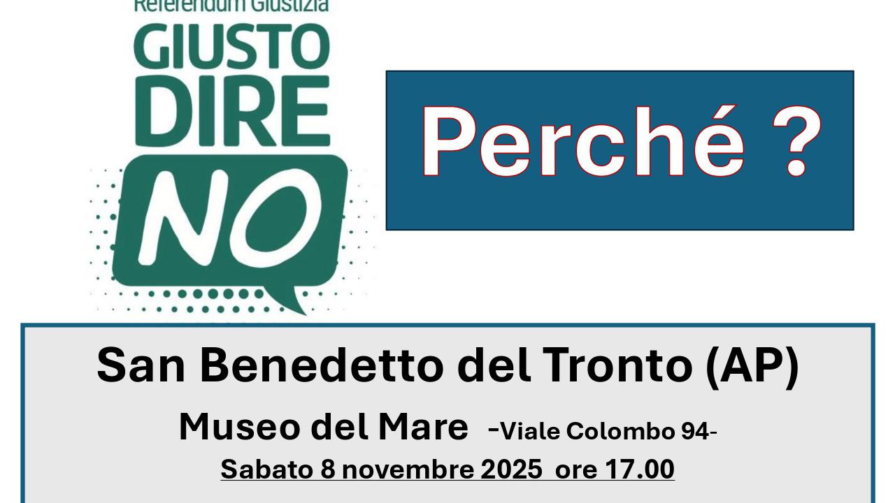 Sabato 8 novembre, dalle 17.00, è in programma al Museo del Mare di San Benedetto del Tronto un incontro sul referendum giustizia e le ragioni del No. L'evento, promosso dal procuratore della Repubblica del tribunale di Ascoli Piceno, Umberto Monti in qualità di presidente dell’Anm Marche, vedrà la partecipazione di Edmondo Bruti Liberati, già capo della procura di Milano, insieme a Lorenzo Picardi, funzionario dell’Ufficio per il Processo della Corte d’Appello di Ancona, e all’avvocato Claudio Voltattorni del foro di Ascoli.