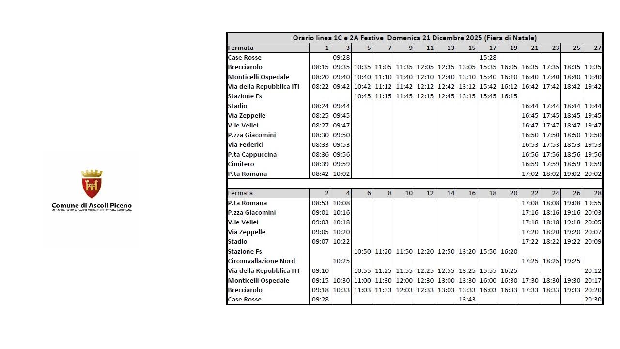 In occasione della Fiera di Natale, in programma Domenica 21 Dicembre, l’Amministrazione comunale di Ascoli Piceno e l’azienda di trasporto pubblico Start spa hanno intensificato le corse in direzione centro delle linee 1C e 2A. Vista la concomitanza della partita casalinga dell’Ascoli Calcio, sono previste alcune variazioni nei percorsi (come da file allegato).