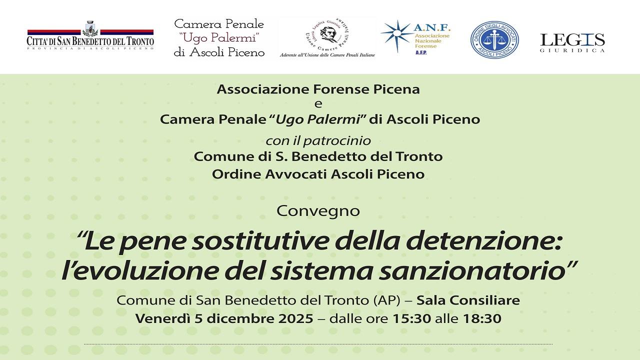 Questi temi sono stati oggetto della pubblicazione, recentemente edita da Legis Giuridica, “Le pene sostitutive della detenzione: norme e procedimenti”, scritta dall’avv. Massimiliano Castagna del Foro di Ascoli Piceno, e saranno al centro del convegno “Le pene sostitutive della detenzione: l’evoluzione del sistema sanzionatorio”, organizzato dall’Associazione Forense Picena e dalla Camera Penale “Ugo Palermi” di Ascoli Piceno, che si terrà il prossimo 5 dicembre, dalle ore 15:30, nella sala consiliare del Comune di San Benedetto.