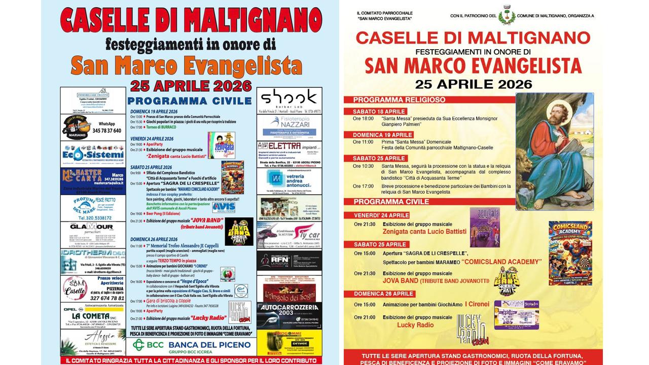 Durante tutte le serate saranno attivi stand gastronomici, ruota della fortuna, pesca di beneficienza e proiezione di foto e immagini “come eravamo”. La festa di San Marco rappresenta un momento di forte identità per Caselle di Maltignano, capace di unire tradizione religiosa e vita sociale, coinvolgendo attivamente associazioni, volontari e cittadini. Il Comitato organizzatore rinnova l’invito alla partecipazione, ringraziando il Comune di Maltignano per il patrocinio, gli sponsor e tutti i collaboratori per il supporto alla realizzazione dell’evento.