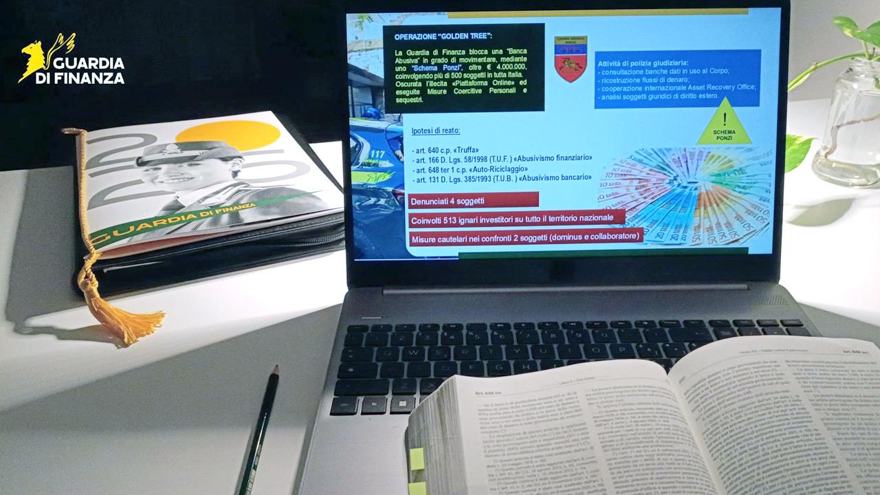 I militari del Comando Provinciale della Guardia di Finanza di Ancona, nell’ambito delle attività finalizzate a contrastare i fenomeni illeciti di natura finanziaria che ledono l'integrità del sistema economico e commerciale dello Stato, hanno contestato l’esistenza di un presunto sodalizio criminale volto alla costituzione di un abusivo istituto bancario parallelo basato su uno schema Ponzi, capace di movimentare oltre 4 milioni di euro e di coinvolgere più di 500 persone sull’intero territorio nazionale. Nell’ambito dell’operazione, denominata “Golden Tree”, sono state eseguite misure cautelari personali, sequestri di conti correnti e l’oscuramento della piattaforma online utilizzata per le attività illecite.