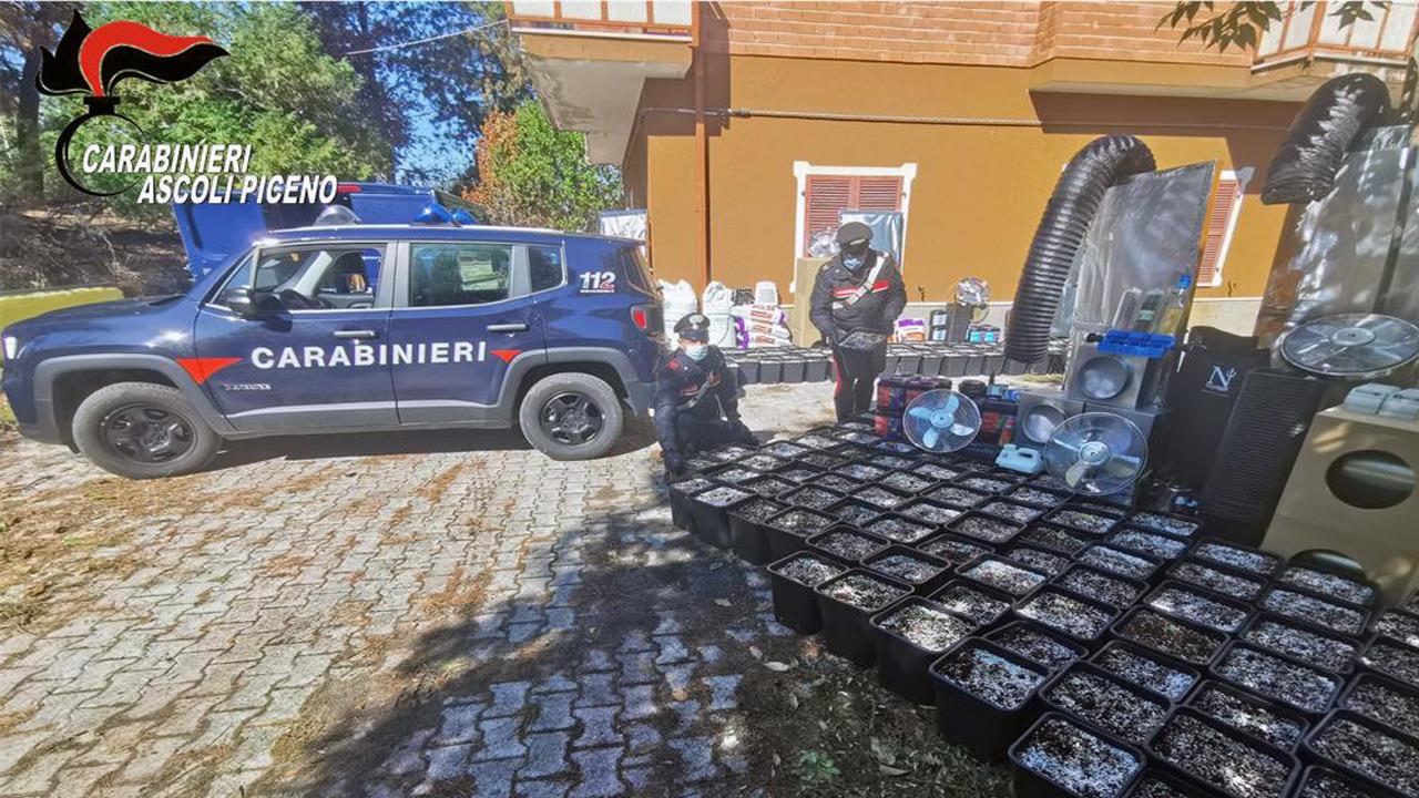 Servizi preventivi e controlli mirati hanno consentito ai Carabinieri di Ascoli Piceno di irrompere in un casolare della periferia ascolana, sorprendendo un trentenne di origini albanesi, in Italia senza fissa dimora, intento a prendersi cura di una piantagione indoor di marijuana. Cinque stanze a piano terra completamente adibite a serra con 1.500 vasi di piante e un impianto sofisticato di illuminazione e irrigazione da un pozzo attiguo all’abitazione, ben organizzato dall’uomo con tanto di riscaldamento a parete, rilevatori di temperatura ed umidità.