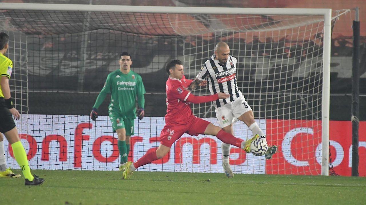 In avvio botta di Guiebre dal vertice dell'area di poco sopra la traversa. Passa un minuto e l'Ascoli va a segno: Rizzo Pinna serve bene Silipo in area, tiro ravvicinato respinto da Sorzi, arriva Chakir ed a porta praticamente sguarnita sigla il suo quarto gol in campionato. Ammoniti in successione Rossini e Rizzo. Al 16' il Picchio raddoppia: splendido lancio di 50 metri di Rizzo Pinna per Silipo che si accentra, punta e supera Rigo e poi batte Sorzi con una conclusione potente deviata con la coscia da Pietra. Al 19' rimessa laterale lunga di Zagnoni, Pietra appoggia per Figoli, mancino di prima intenzione che termina out. Al 32' Cassani opta per una card FVS per un sospetto tocco con il braccio in area sugli sviluppi di un corner, Mastrodomenico rivede l'azione al monitor e non concede il rigore. Al 35' tentativo in area di Pietra di poco out dopo una punizione dalla trequarti di Stanzani. Viene ammonito pure Chakir per un intervento falloso sulla trequarti. Al 42' tiro a giro di D'Uffizi dal lato corto dell'area, respinge Sorzi in tuffo. Al 45' Ascoli va in gol ancora con Silipo con un bel tiro a giro col sinistro, ma la rete viene annullata per un tocco di D'Uffizi sulla linea in posizione di fuorigioco. Nel recupero della prima frazione intervento decisivo in scivolata di Rizzo a schermare un diagonale pericoloso di Stanzani ben liberato da Rosetti.