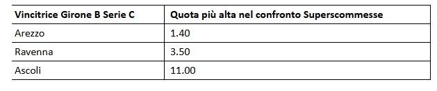 Di seguito le quote vincente Serie C relative alle squadre accreditate per il girone B: