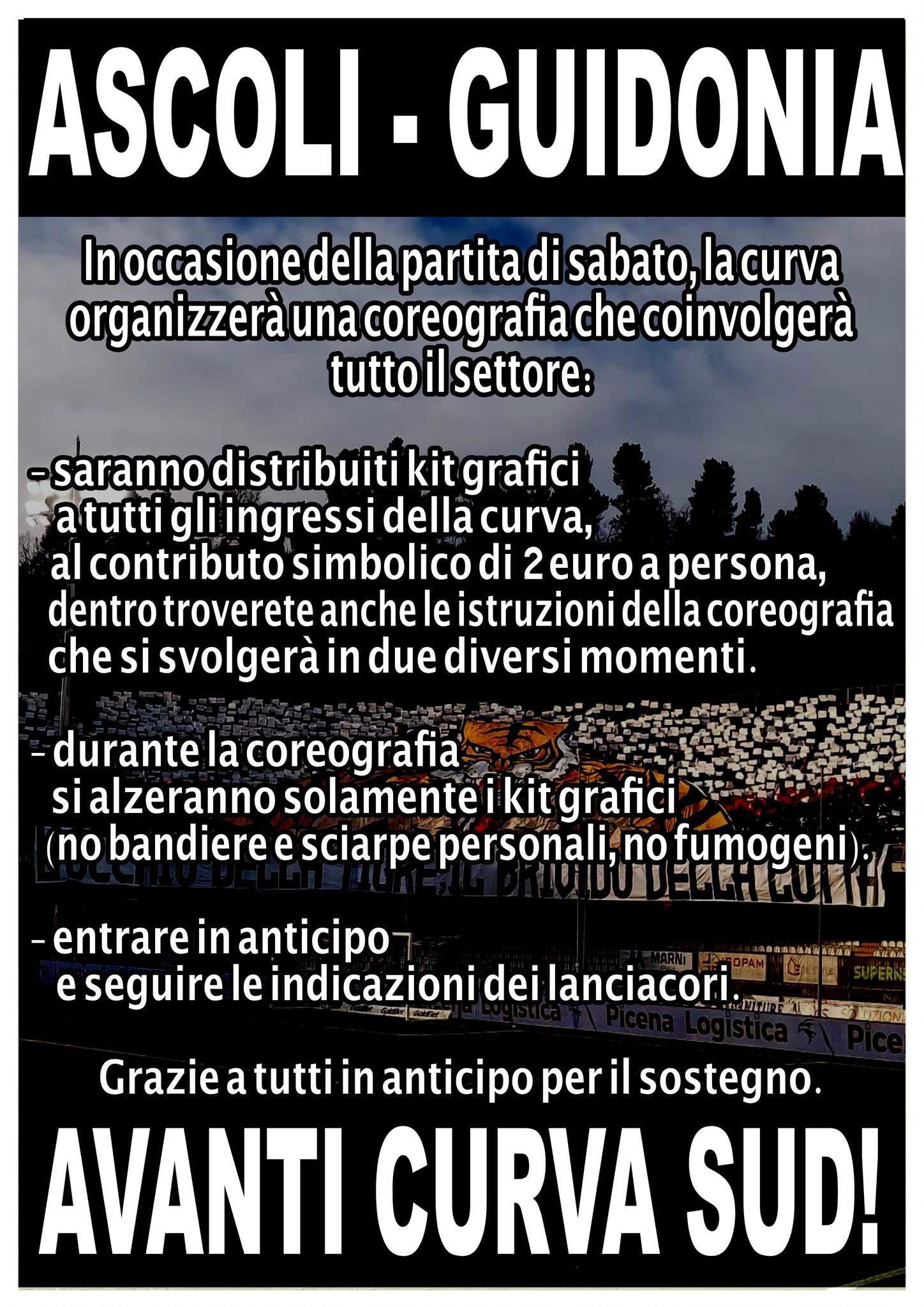 I tifosi dell'Ascoli si stanno organizzando per creare un grande spettacolo in occasione del match con il Guidonia in programma Sabato 18 Aprile alle ore 20:30 allo stadio "Del Duca" per la 37esima e penultima giornata del girone B del campionato di Serie C.