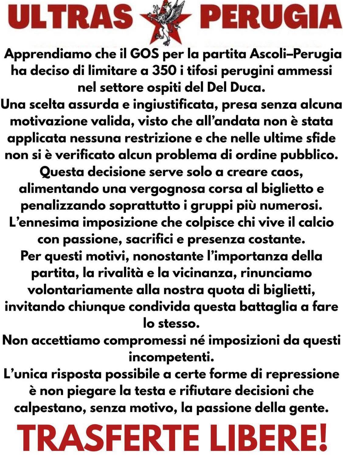 Ecco il comunicato ufficiale pubblicato via social: "Apprendiamo che il GOS, per la partita Ascoli-Perugia, ha deciso di limitare a 350 i tifosi perugini ammessi nel settore ospiti del Del Duca. Una scelta assurda, ingiustificabile e presa senza alcuna motivazione valida, visto che all’andata non è stata applicata nessuna restrizione e visto che nelle ultime sfide non si è verificato nessun problema di ordine pubblico. Questa decisione serve solo a creare caos, alimentando una vergognosa corsa al biglietto e penalizzando soprattutto i gruppi più numerosi. L’ennesima imposizione che colpisce chi vive il calcio con passione, sacrifici e presenza costante.