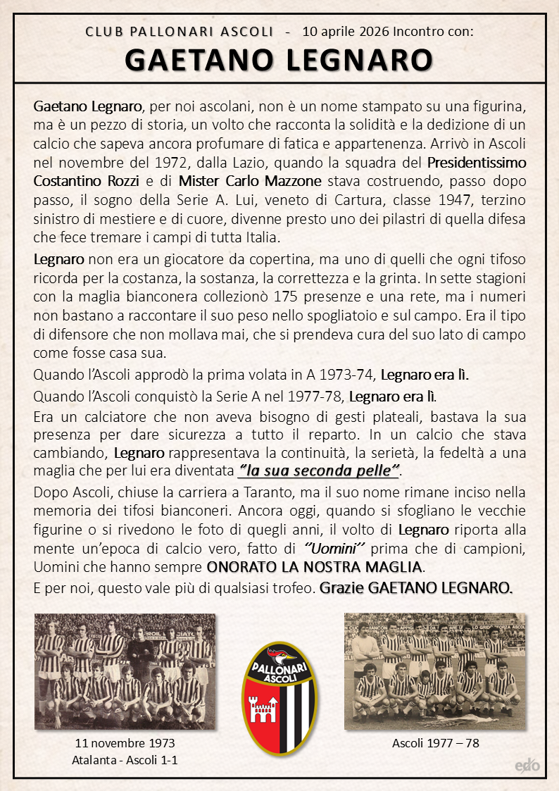 Vi proponiamo le dichiarazioni al nostro microfono di Gaetano Legnaro nel corso della cena a cui ha partecipato stasera al ristorante "Villa Angelini" di Ascoli Piceno insieme ai tifosi del club "Pallonari". Al momento conviviale hanno preso parte anche alcuni rappresentanti dei club bianconeri "Veterani" e "Fedelissimi Arquata".