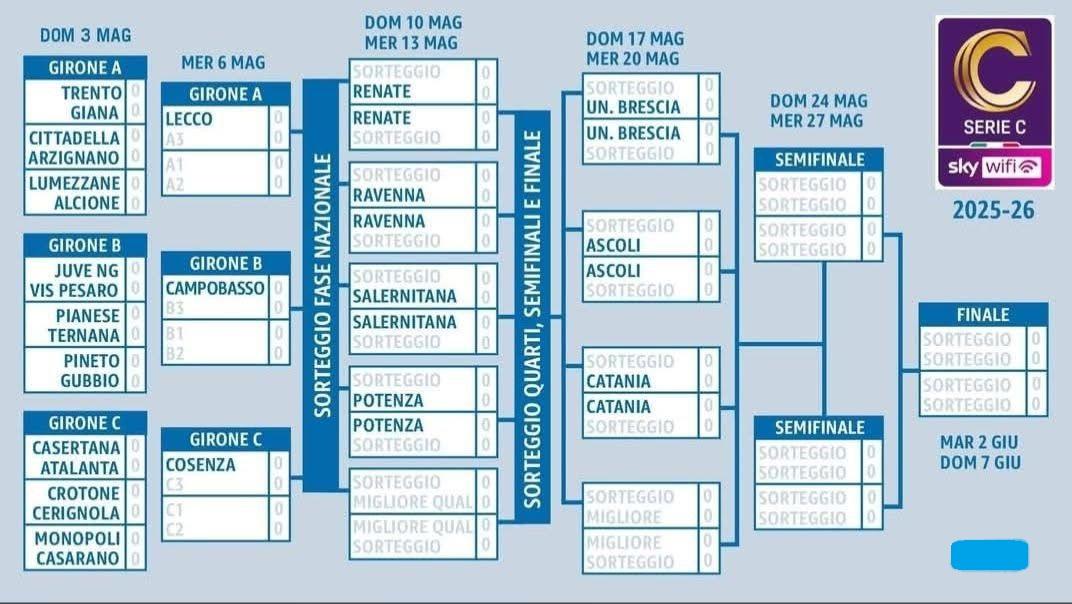 nella posizione di griglia nei playoff (prevista per la vincitrice della Coppa) subentrerà l’altra squadra finalista di Coppa Italia Serie C.