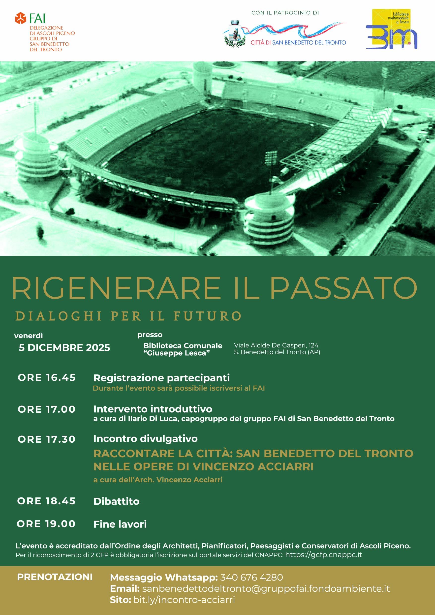 Nell’ambito del ciclo di incontri “Rigenerare il passato. Dialoghi per il futuro”, il Gruppo FAI San Benedetto del Tronto propone venerdì 5 dicembre, presso la Biblioteca Multimediale “G. Lesca” di San Benedetto del Tronto, un appuntamento speciale con l’architetto Vincenzo Acciarri, figura centrale nella trasformazione urbana sambenedettese degli ultimi cinquant’anni, dal titolo “Raccontare la città: San Benedetto del Tronto nelle opere di Vincenzo Acciarri”. Acciarri racconterà San Benedetto attraverso le sue opere, guidandoci tra i luoghi che ha progettato e che oggi fanno parte della nostra vita quotidiana. Dallo Stadio Riviera delle Palme, esposto al MAXXI di Roma come esempio di eccellenza contemporanea, fino ad altre opere che hanno segnato la vita urbana, l’incontro offrirà uno sguardo privilegiato su come gli spazi costruiti possano diventare narrazione, testimonianza e futuro. Il programma si aprirà alle ore 16.45 con l’accredito dei partecipanti, seguito alle ore 17.00 dall’intervento introduttivo di Ilario Di Luca, capogruppo FAI San Benedetto del Tronto. Alle ore 17.30 l’incontro divulgativo a cura dell’architetto Vincenzo Acciarri. Infine alle ore 18.45 dibattito e alle 19.00 fine dei lavori. L’evento, che ha ricevuto il patrocinio del Comune di San Benedetto del Tronto ed è accreditato dall’Ordine degli Architetti, Pianificatori, Paesaggisti e Conservatori di Ascoli Piceno con il riconoscimento di 2 CFP, chiude il ciclo di conferenze proposto nel corso del 2025 dal Gruppo FAI San Benedetto, con l’obiettivo di offrire una riflessione sul valore del costruire e sul ruolo dell’architettura oggi. L’evento è rivolto a tutti, iscritti FAI e non iscritti. Durante l’evento sarà possibile iscriversi al FAI.