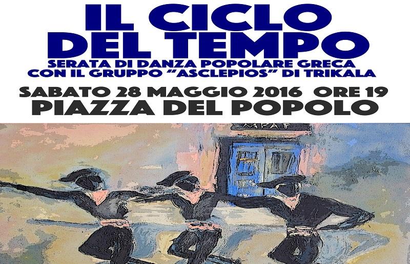 Nell'ambito delle iniziative della Settimana della Famiglia, sabato 28 maggio, alle ore 19, in Piazza del Popolo la Comunità Ellenica delle Marche, guidata dal presidente Georgios Solomos, presenterà il gruppo di Danze Popolari Greche "Asclepiòs" di Trikala (Grecia), composto di 30 ballerini e ballerine e 4 musicisti che si esibiranno nello spettacolo dal titolo "Il Ciclo del Tempo"