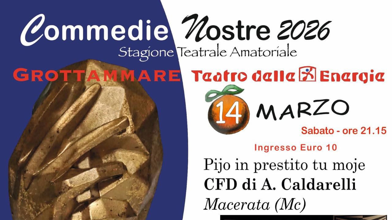 Continua con successo la Rassegna di Teatro Amatoriale Dialettale “Commedie Nostre”, organizzata dalla Proloco di Grottammare Lido degli Aranci. Dopo la simpaticissima Compagnia Teatrale “Gli Indimenticabili” di Amandola, sabato 14 marzo è la volta della “Cfd di A.Caldarelli” con la commedia brillante "Pijo in prestito tu moje" di Luca Franco. Personaggi e interpreti. Nicola: Fabio Campetella; Leonardo: Giacomo Cingolani; Marta: Manuela Campetella; Valerio: Mauro De Luca; Agata: Rossella Calfon; Raffaele: Corrado Papa. Scenografia e tecnico luci: Stefano Zagaglia; Tecnico audio: Paolo Andreani; direttore di palcoscenico: Anna Maria Scuppa. "Viviamo in una società che vanta di essere moderna e in continua evoluzione eppure quando si trattano determinati argomenti ci accorgiamo che in fondo nulla è cambiato. La commedia di Luca Franco cerca di smuovere le coscienze assopite con ritmo e risate, nel tentativo di sdoganare definitivamente, in maniera anche cruenta e provocatoria, preconcetti e tabù relativi al rapporto di coppia. Il concetto è chiaro: “L’amore è tanto semplice”, ciascuno di noi può amare un uomo o può amare una donna, “se ami fai di tutto per rendere l’altro felice… e se uno dei due non ama più… è finita!”. Momento poetico questa volta a cura di Mascia Lanciotti, conduce Alessandra Mora. Ingresso unico €10 con posti numerati. Info e biglietteria al 335.6234568 - Associazione Lido degli Aranci Proloco. Prevendite solite persso il Cin Cin Bar e il Bar Spadino a Grottammare e presso il Laborfoto di Domenico Campanelli a San Benedetto delTronto. Dopo questo sabato la rassegna si fermerà per tutto il periodo pasquale, per riprendere l'11 aprile con “Li freciute” di Ascoli Piceno e la loro divertentissima commedia dialettale dal titolo “Non è come sembra!” e per prepararsi per l'evento primaverile di punta del Lido dal titolo “Neapulse-il battito di Napoli, l’Anima di Pino”, omaggio a Pino Daniele con la partecipazione straordinaria di Fabrizio Bosso, evento per cui la vendita è già schizzata a livelli alti con più di metà teatro già pieno.Affrettatevi, noi ve lo abbiamo detto, per accaparrarvi gli ultimi posti e per dire… "io c'ero"!