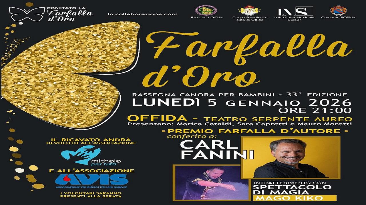 Fervono i preparativi per “La Farfalla d’Oro”, storica rassegna canora dedicata ai più giovani, in programma domenica 5 gennaio alle ore 21 presso il Teatro Serpente Aureo di Offida. Giunta alla 33ª edizione, la manifestazione è organizzata dal Comitato “La Farfalla d’Oro”, presieduto da Sabina Premici, in collaborazione con Amministrazione comunale di Offida, Pro Loco, Istituto Musicale “Giuseppe Sieber” e Corpo Bandistico “Città di Offida”.