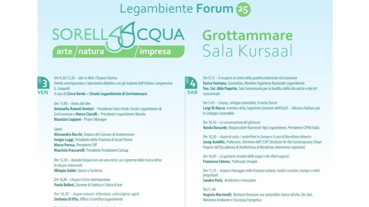 Grottammare vuole essere capitale del dialogo sull’acqua come bene comune con la prima edizione del Forum “Sorella Acqua – arte, natura, impresa”, in programma il 3 e 4 ottobre 2025 nella cornice della Sala Kursaal. L’iniziativa nasce da un progetto del project manager Maurizio Capponi e dell’Arch. Sandro Polci, membro della Presidenza del Comitato scientifico di Legambiente. Promossa dal Circolo Legambiente Civico Verde di Grottammare in collaborazione con Legambiente Marche e con il Comune Città di Grottammare, che ha patrocinato l’iniziativa insieme alla Provincia di Ascoli Piceno, sostenuta con il contributo della CIIP spa e della Fondazione Carisap. “Sorella Acqua” è un appuntamento che mette in dialogo linguaggi diversi – artistici, scientifici, educativi, spirituali – per costruire una nuova narrazione collettiva dell’acqua come bene comune. Un evento che coinvolge scuole, cittadini, associazioni, enti pubblici e imprese, rafforzando il legame tra comunità e territorio e rilanciando l’impegno di Legambiente e dei partner per la tutela delle risorse naturali e il contrasto alla crisi climatica. Il Forum si inserisce idealmente nel percorso già avviato con le mostre fotografiche, inaugurate lo scorso 12 settembre e visitabili il 3 e 4 ottobre, del “World Day Photo Contest 2025 “ Un viaggio tra diritti, memorie e immagini del mondo” e “ CIIP 70” che celebra i 70 anni dalla sua fondazione. Immagini che hanno accompagnato la città in un viaggio tra foto storiche e contemporanee dedicate all’acqua, bene prezioso e diritto universale. Il Forum prenderà avvio nella cornice di Palazzo Kursaal venerdì 3 ottobre, ore 9.30, con il laboratorio didattico “Idee in Rete: l’Acqua Creativa”, condotto dal Civico Verde Grottammare, dedicato agli studenti, fino alle 12:30. Alle 15, dopo i saluti istituzionali, si darà spazio alle sessioni di approfondimento, tra arte, spiritualità, ambiente e impegno civile. Tra gli ospiti: storici, critici d’arte, esperti di gestione idrica e rappresentanti di enti e fondazioni, chiamati a riflettere su come l’acqua sia al tempo stesso risorsa naturale, ispirazione artistica e patrimonio spirituale. La mattinata di sabato 4 ottobre, ore 9.15, sarà invece dedicata a temi chiave per lo sviluppo sostenibile e la gestione del futuro: dalla qualità ambientale al recupero dei siti contaminati, dalla conservazione dei ghiacciai alla gestione circolare delle acque, fino ai rapporti tra paesaggio, città e aree rurali. Ampio spazio sarà dato anche allo sport e al valore educativo dell’acqua, con l’intervento di ospiti nazionali e internazionali. Il Forum si concluderà con una tavola rotonda di confronto, condotta da Marco Ciarulli, Presidente di Legambiente Marche, tra istituzioni, imprese e ordini professionali su come declinare i principi di sostenibilità a livello locale, con l’obiettivo di delineare strategie condivise per il territorio.