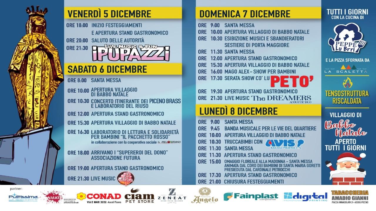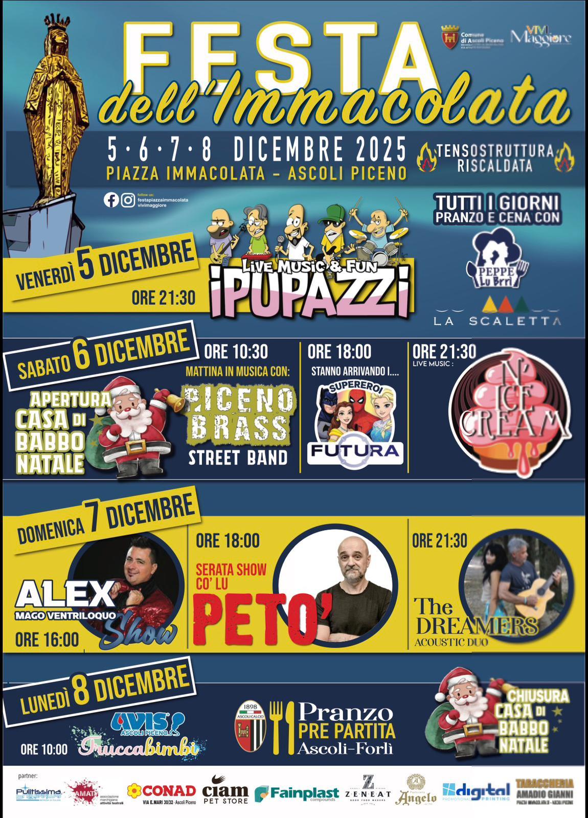 Ad aprire la “Festa dell’Immacolata” sarà il gruppo de “I Pupazzi” domani 5 dicembre, mentre il giorno dopo i riflettori saranno puntati sul quintetto “Piceno Brass”, sui supereroi dell’associazione “Futura” e sul live dei “N’Ice Cream”. Particolarmente ricca anche la data di domenica 7 dicembre, che verrà aperta dall’artista ventriloquo “Mago Alex”, per poi lasciare il posto alle ore 18 allo show di “Petò” e terminare poi alle ore 21,30 con il duo “The Dreamers”. La giornata di lunedì 8 dicembre sarà contraddistinta anche da momenti religiosi, come quello con l’omaggio floreale alla Madonna, la processione e la Santa Messa. In tutta la durata della manifestazione sarà presente la casetta di Babbo Natale, per la gioia dei bambini presenti, a cui saranno rivolti anche i laboratori del riuso, di letteratura e di trucco. Infine, all’interno della tensostruttura ci sarà un punto di raccolta in cui potranno essere lasciati regali di Natale rivolti ai degenti del reparto di Pediatria.