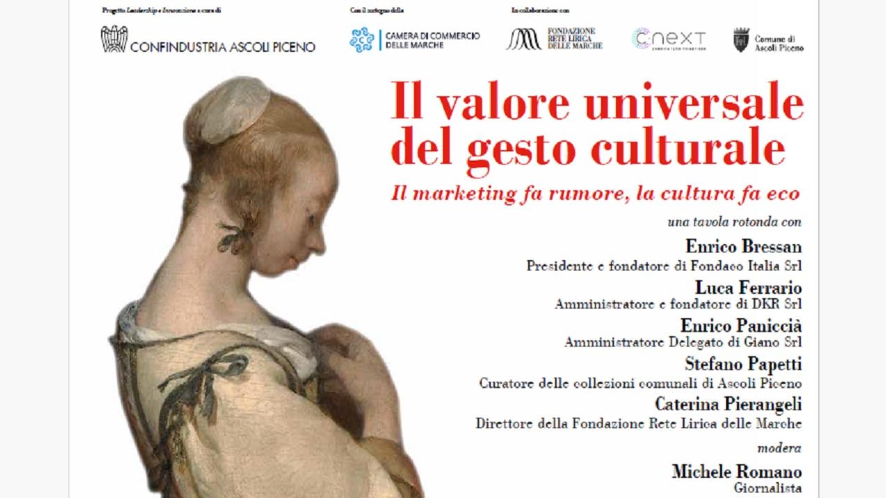 Giovedì 4 Dicembre 2025, il Teatro Ventidio Basso di Ascoli Piceno ospiterà l’evento “Il valore universale del gesto culturale”, un appuntamento pensato per raccontare il ruolo strategico della cultura nella vita delle imprese, nella loro reputazione e nella relazione con la comunità, promosso da Confindustria Ascoli Piceno, con il sostegno della Camera di Commercio delle Marche nell'ambito del progetto Leadership e Innovazione, e in collaborazione con Fondazione Rete Lirica delle Marche, Cnext e Comune di Ascoli Piceno.