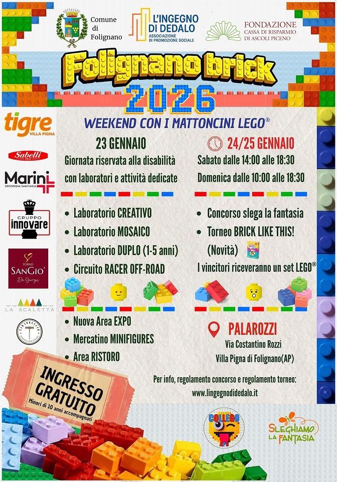 Dopo lo straordinario successo delle passate edizioni, il PalaRozzi di Villa Pigna di Folignano si prepara a ospitare la terza edizione di “Folignano Brick”, un fine settimana interamente dedicato al leggendario mondo dei mattoncini LEGO. L’evento, organizzato dall'associazione L'ingegno di Dedalo in collaborazione con Sleghiamo la Fantasia e con il patrocinio del Comune di Folignano e della Fondazione Carisap, promette di trasformare il palazzetto in un grande centro di creatività diffusa per appassionati di tutte le età.