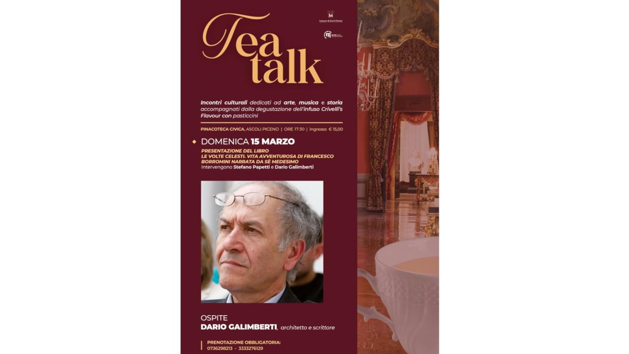 Domenica 15 marzo alle ore 17:30 tornano i Tea Talk organizzati dall'Amministrazione Comunale e da Ascoli Musei nelle sontuose sale della Pinacoteca Civica. Un'occasione imperdibile per sorseggiare Crivelli's Flavour, il tè appositamente creato per i Musei Civici, e per ascoltare un interessante intervento del prof. Dario Galimberti dell'Università di Lugano, vincitore del prestigioso Premio Internazionale di Architettura Andrea Palladio, che presenterà il suo volume "Le volte celesti" dedicato agli ultimi giorni di vita del grande architetto barocco Francesco Borromini. Afflitto da una continua competizione che lo vedeva sempre in secondo piano rispetto al rivale Bernini, Borromini cercò la morte trafiggendosi con la sua stessa spada e, prima di soccombere, ebbe modo di raccontare la propria vita fatta di successi e di rapide cadute ad un allievo. Galimberti traccia così il profilo umano di uno dei maggiori architetti del tempo, al quale si devono creazioni di grande fascino visionario come le chiese romane di S. Ivo alla Sapienza, di San Carlo alle Quattro Fontane, di Sant'Agnese o la vertiginosa scala ovale di Palazzo Barberini, fonte di ispirazione per tanti architetti del settecento europeo. Prenotazione obbligatoria 0736 298213 / 333 3276129