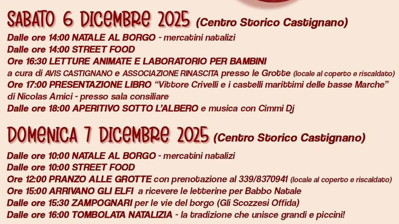 Fin dal pomeriggio di sabato, dalle 14:00, Castignano si animerà con i mercatini natalizi, un percorso tra artigianato, idee regalo e prodotti tipici, accompagnati dall’immancabile street food, che inebrierà le strade del borgo. Il pomeriggio proseguirà con iniziative dedicate ai più piccoli: alle 16:30, alle Grotte, locale coperto e riscaldato, i bambini saranno accolti da letture animate e da un laboratorio creativo a cura dell’AVIS di Castignano e dell’Associazione Rinascita.