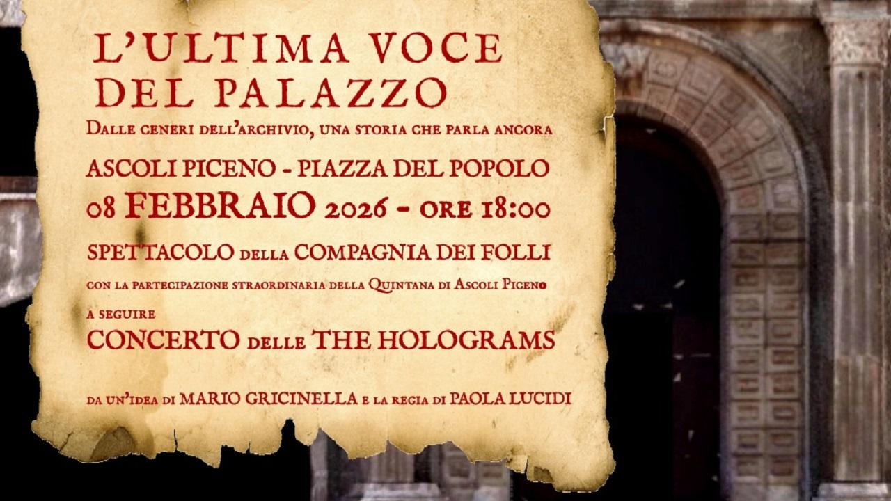 L’Archivio di Stato di Ascoli Piceno, in sinergia con il Comune di Ascoli Piceno e la Compagnia dei Folli, presenta “L’ultima voce del palazzo. Dalle ceneri dell’Archivio, una storia che parla ancora”, viaggio teatrale che nasce dal rigore della ricerca scientifica per restituire voce alla storia della comunità e che andrà in scena domenica 8 febbraio 2026 alle ore 18:00 in Piazza del Popolo ad Ascoli Piceno.