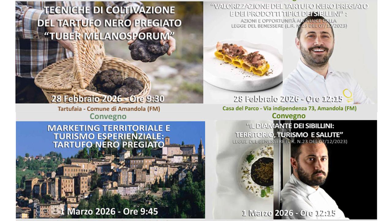 Sabato 28 febbraio 2026 e Domenica 1 Marzo 2026 al via la 7^ edizione “Diamanti a Tavola – Festival del Tartufo Nero Pregiato di Amandola e dei prodotti tipici dei Sibillini” Appuntamento con tre convegni ed una sessione pratica di approfondimento dedicata al tartufo nero pregiato, con appuntamenti tecnici e divulgativi rivolti a operatori del settore, appassionati e cittadini. L’iniziativa rientra nelle azioni di informazione del CSR Marche 2023/27 – Intervento SRH04 – Annualità 2024 organizzati da Partners in Service srl, titolare del CEA Ambiente e Mare, R. Marche, riconosciuto Organismo di Consulenza aziendale per le Imprese Agricole e Forestali - Sviluppo Aree Rurali e Qualità delle Produzioni R. Marche MASAF /ISMEA in collaborazione con il Comune di Amandola, ATAM Associazione Tartufai dei Monti Sibillini.