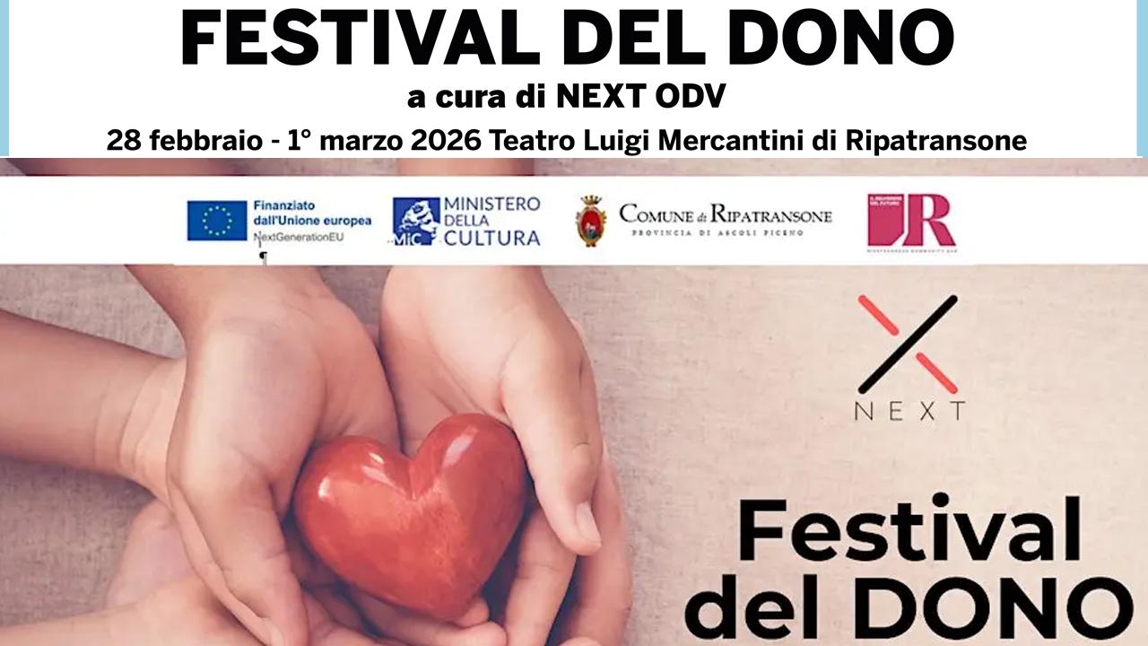 Il Teatro Luigi Mercantini di Ripatransone ospita nelle giornate del 28 febbraio e 1° marzo 2026 il Festival del DONO, un evento promosso da NEXT ODV all’interno dell’intervento Casa del Donatore, che mette al centro il valore del dono come pratica capace di generare legami, trasformazione sociale e futuro condiviso.