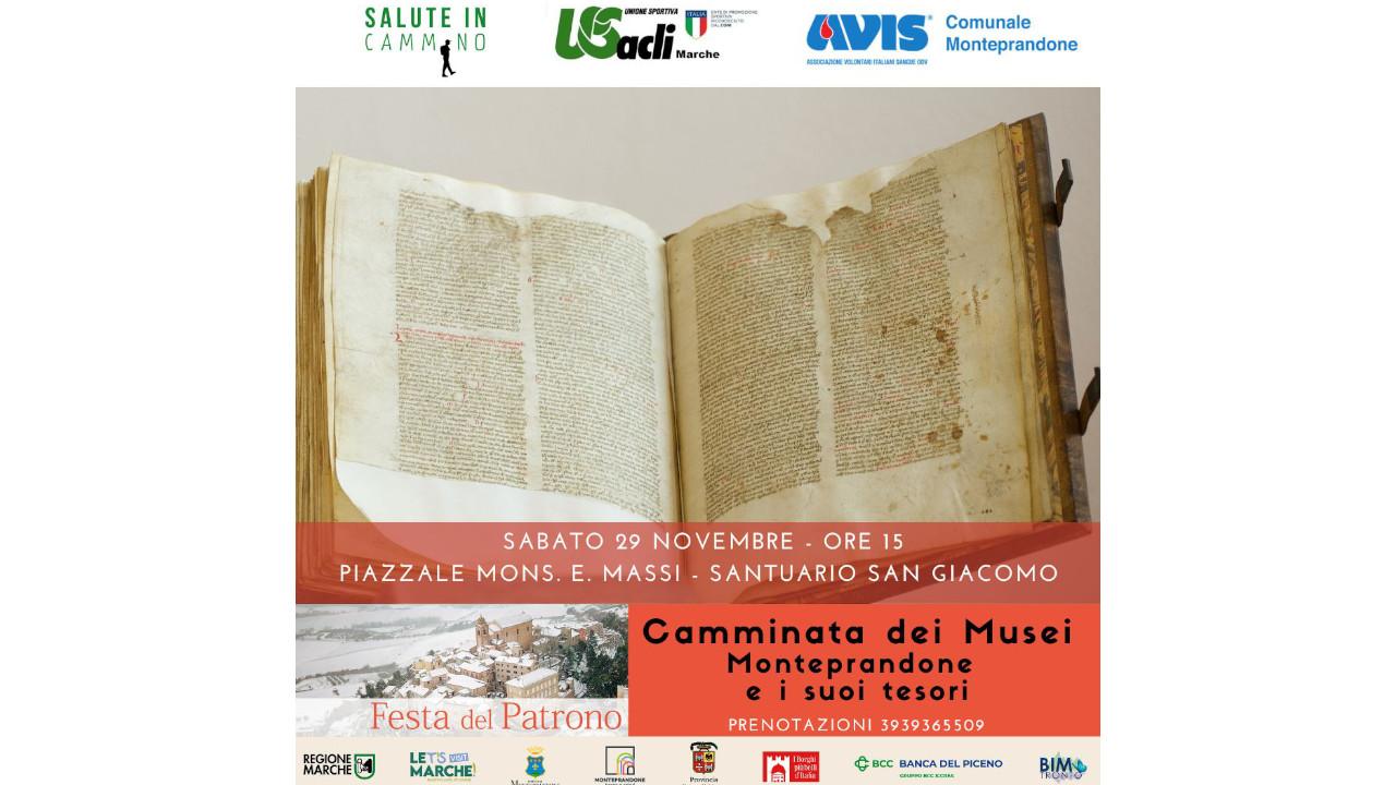 Sabato 29 Novembre è in programma un nuovo appuntamento col progetto “Camminata dei musei”. L’iniziativa si svolgerà a Monteprandone, in occasione delle festività patronali, e prevede la visita del borgo, del Museo dei codici di San Giacomo della Marca e dell’annesso Museo sistino La manifestazione si svolgerà dalle 15 (ritrovo nel Piazzale Mons. Massi presso il Santuario di San Giacomo della Marca) alle 17 circa, è promossa da Unione. Sportiva Acli provinciale di Ascoli Piceno/Fermo con il sostegno del Bim Tronto e della Regione Marche, in sinergia Avis Monteprandone e con il Sistema Museale Piceno, con il patrocinio del Comune di Monteprandone. La partecipazione è gratuita e aperta a un massimo di 40 persone; per partecipare è necessario prenotare inviando un messaggio al numero 3939365509 con nome, cognome e il luogo di svolgimento della manifestazione. Per conoscere il calendario completo delle iniziative del progetto “Camminata dei musei” è possibile consultare la pagina Facebook Unione Sportiva Acli Marche, visitare il sito www.cooperativemarche.it oppure inviare un messaggio WhatsApp al numero 3495711408.