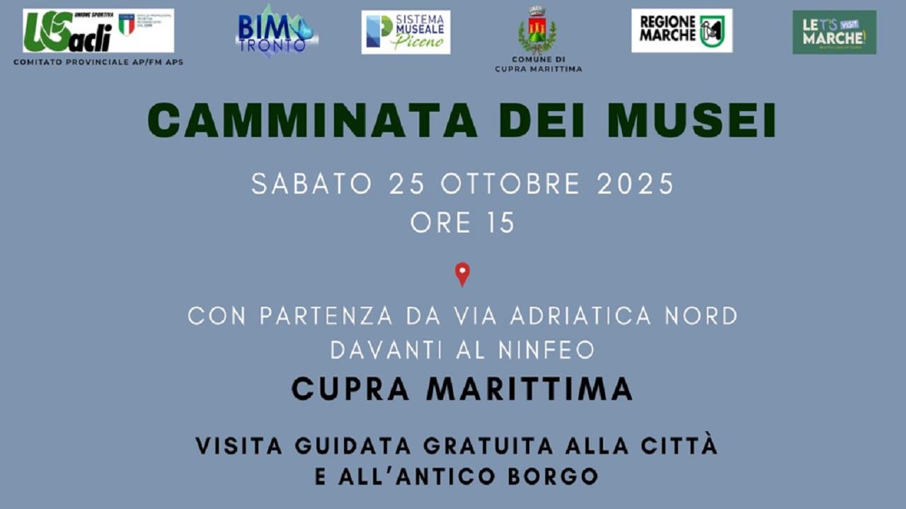 Sabato 25 ottobre, Cupra Marittima sarà protagonista di un pomeriggio dedicato alla scoperta del patrimonio culturale locale, grazie a una nuova tappa del progetto “Camminata dei musei”. L’iniziativa, che si svolgerà dalle 15 alle 17:30 circa, è promossa dalla U.S. Acli provinciale di Ascoli Piceno/Fermo con il sostegno del Bim Tronto e della Regione Marche, in sinergia con il Sistema Museale Piceno e con il patrocinio del Comune di Cupra Marittima. Il punto di ritrovo è fissato in via Adriatica Nord, davanti al Ninfeo, nei pressi del Bar Toto: da lì prenderà il via una passeggiata culturale che condurrà i partecipanti tra le bellezze della città e del suo borgo antico, accompagnati da una guida esperta.