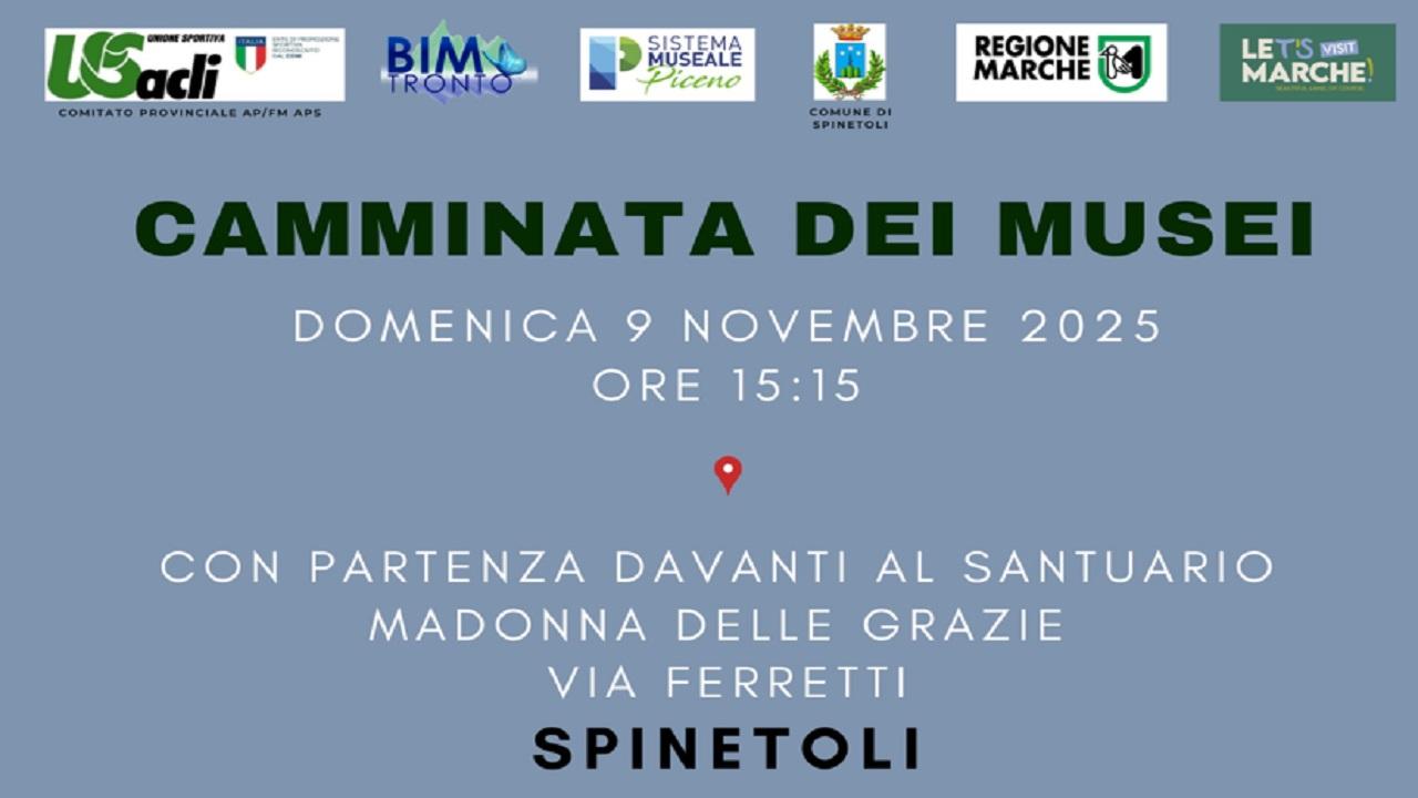 Domenica 9 Novembre, Spinetoli sarà protagonista di un pomeriggio dedicato alla scoperta del patrimonio culturale locale, grazie a una nuova tappa del progetto “Camminata dei musei”. L’iniziativa, che si svolgerà dalle 15,15 alle 18 circa circa, è promossa dalla U.S. Acli provinciale di Ascoli Piceno/Fermo con il sostegno del Bim Tronto e della Regione Marche, in sinergia con il Sistema Museale Piceno e con il patrocinio del Comune di Spinetoli.