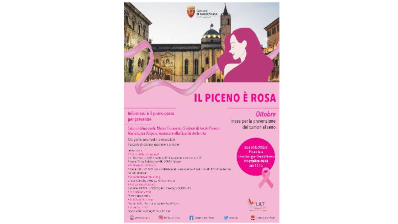 Informarsi è il primo passo per prevenire. Sabato 21 ottobre alla Sala della Vittoria della Pinacoteca Civica, in Piazza Arringo si svolgerà l'incontro “Il Piceno è rosa”. A partire dalle ore 17.15, medici, ricercatori, donne, mamme e amiche saranno protagonisti di questo evento divulgativo di sensibilizzazione, in cui pubblico e privato dialogheranno con contributi preziosi di eccellenze mediche nazionali e internazionali. L’iniziativa, organizzata con il supporto del Centro Medico San Tommaso di Ascoli Piceno e Monsampolo del Tronto, vedrà racconti di donne, mamme e amiche che hanno vissuto sulla propria pelle esperienze forti e vogliono condividerle.
