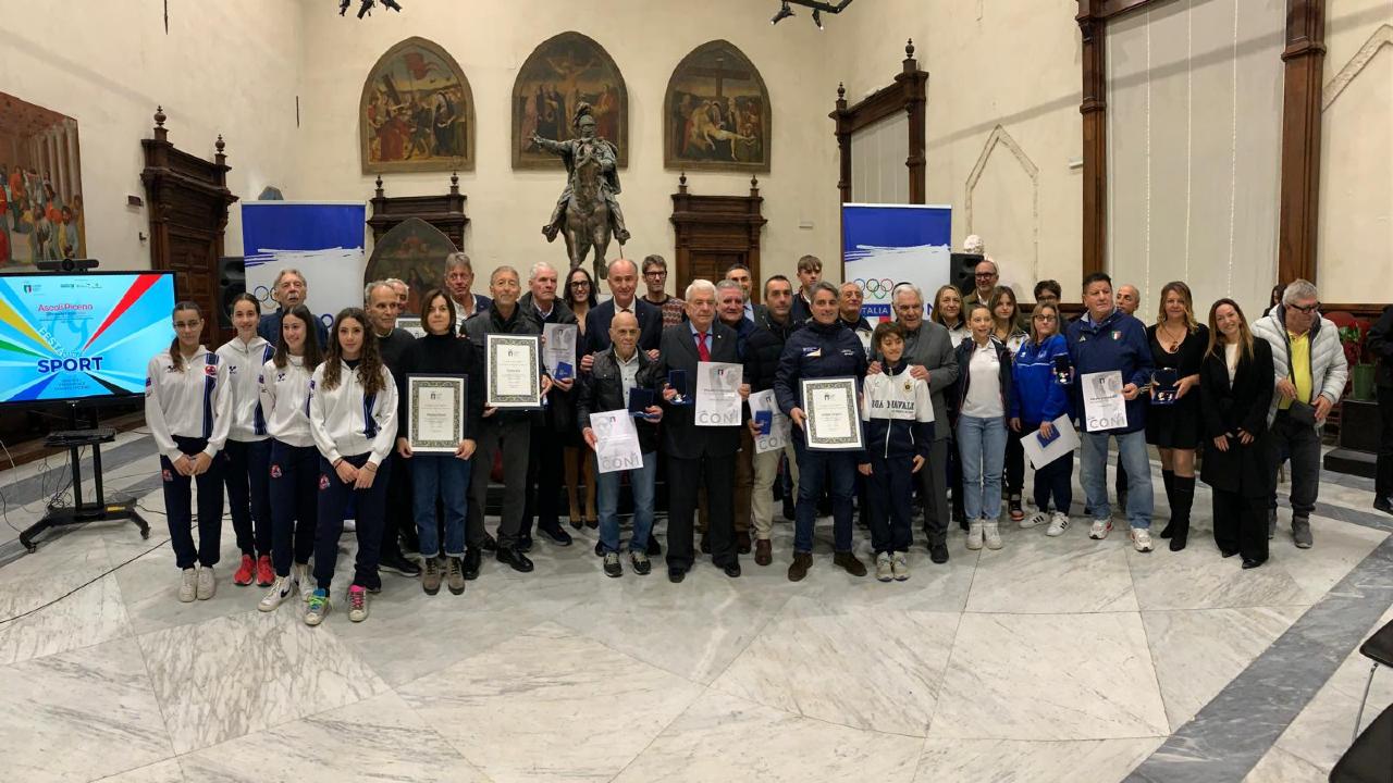 Sport provinciale in grande festa. La Pinacoteca Civica di Ascoli Piceno ha aperto le porte della Sala della Vittoria alle stelle dello sport della Provincia in occasione dell’annuale Festa dello Sport organizzata dal CONI Regionale e Provinciale, con il patrocinio di Regione Marche, Provincia e Comune di Ascoli. Sono stati tantissimi gli appassionati presenti tra sportivi, genitori, semplici appassionati, che hanno visto sfilare i più titolati tecnici, atleti e dirigenti della zona, a cui sono state conferite le onorificenze sportive per antonomasia. Sono anni d’oro per lo sport a livello nazionale e il movimento sportivo attorno alla città di Ascoli ha confermato anche quest’anno le sue grandi qualità con risultati che toccano l’impegno degli atleti ma anche società, dirigenti, tecnici, arbitri, giornalisti sportivi e organizzatori di eventi. Sono stati consegnati 40 riconoscimenti tra Stelle, Medaglie al merito sportivo e Diplomi oltre al premio “Terzo Censi” Atleta Esemplare del CONI Marche che se lo è aggiudicato Mattia De Angelis nella disciplina dell’Atletica Leggera. Da segnalare la Stella d’Argento al Merito Sportivo consegnata a Carlo Sembroni (lotta). Assegnato un riconoscimento anche ad Ascoli Piceno che nel 2025 sarà città europea dello sport.