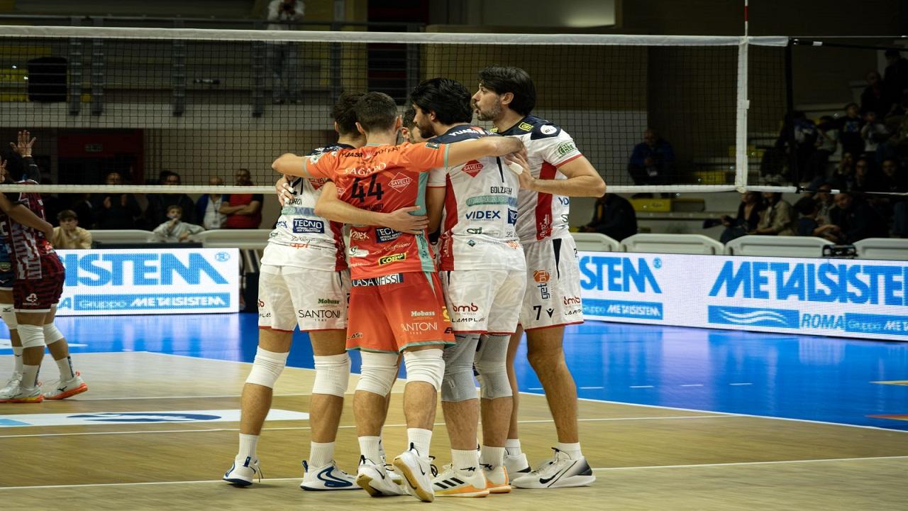 LA CRONACA - Cisterna in campo con Fanizza in diagonale a Guzzo, Plak e Mazzone al centro, Lanza e Bayram in banda con Currie libero. Coach Ortenzi, ancora senza Petkovic, risponde con Falaschi in regia opposto a Golzadeh, Stankovic e Petkov in posto tre, Magalini e Tatarov schiacciatori con Marchisio libero.