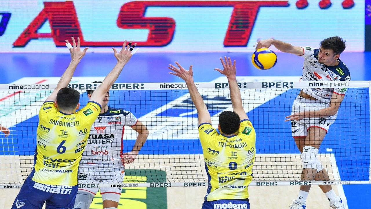 LE FORMAZIONI – Modena in campo con il giovane talento francese Tizi-Oualou in regia con Ikhbayri opposto, Anzani e Sanguinetti al centro, Daviskiba e Porro in banda con Perry libero. Coach Ortenzi schiera invece la stessa formazione tipo delle prime sette giornate, ovvero Falaschi in regia opposto a Golzadeh, Stankovic e Petkov in posto tre, Magalini e Fedrizzi schiacciatori con Marchisio libero.