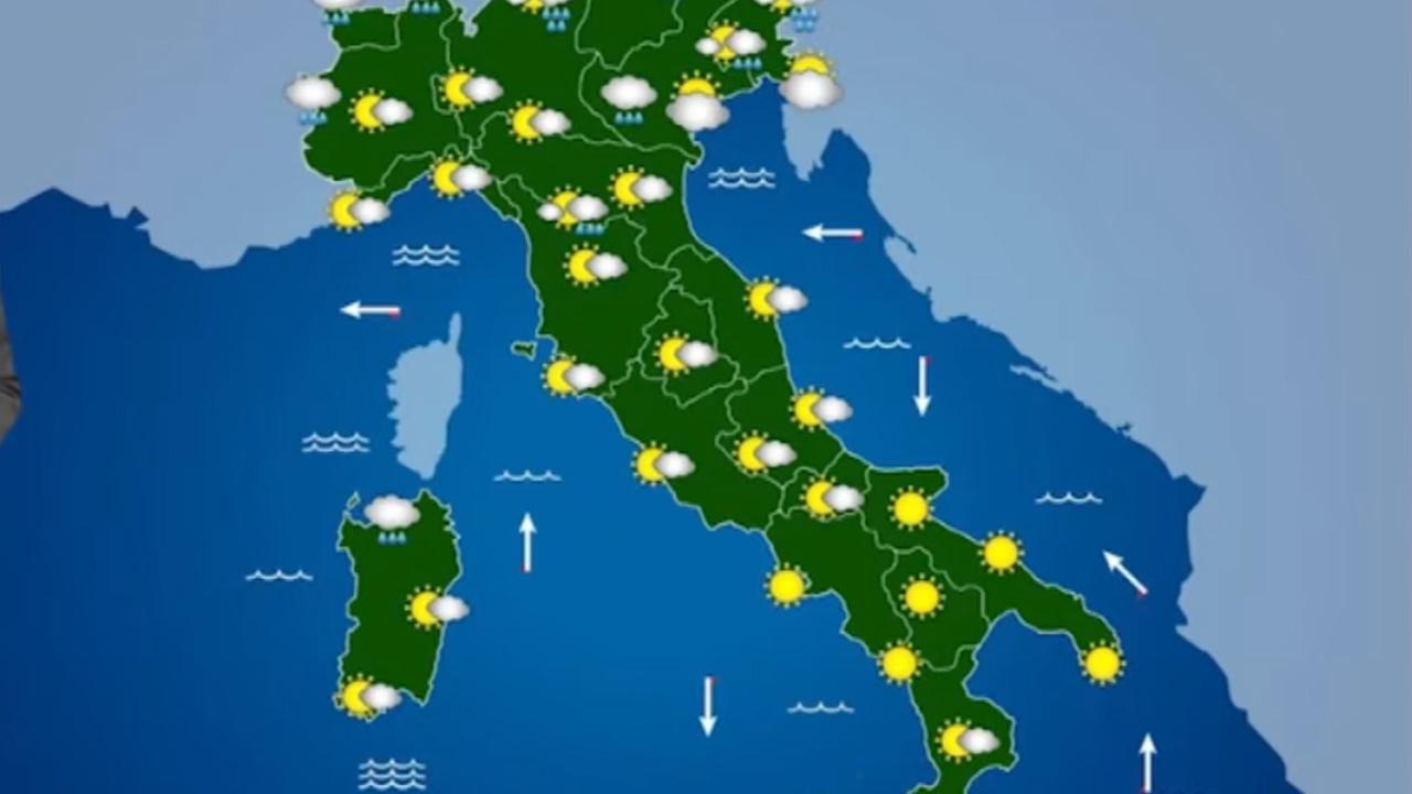 Tempo stabile al mattino su tutte le regioni con cieli sereni o poco nuvolosi. Al pomeriggio possibile qualche piovasco in Appennino, asciutto altrove con velature in transito. Tra la serata e la notte nuvolosità in aumento con anche possibili piogge tra Marche e Abruzzo.